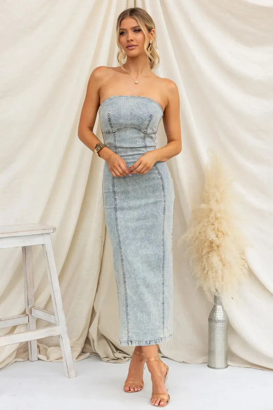 Davi & Dani Denim Binding Detail Smocking Summer Maxi Dress