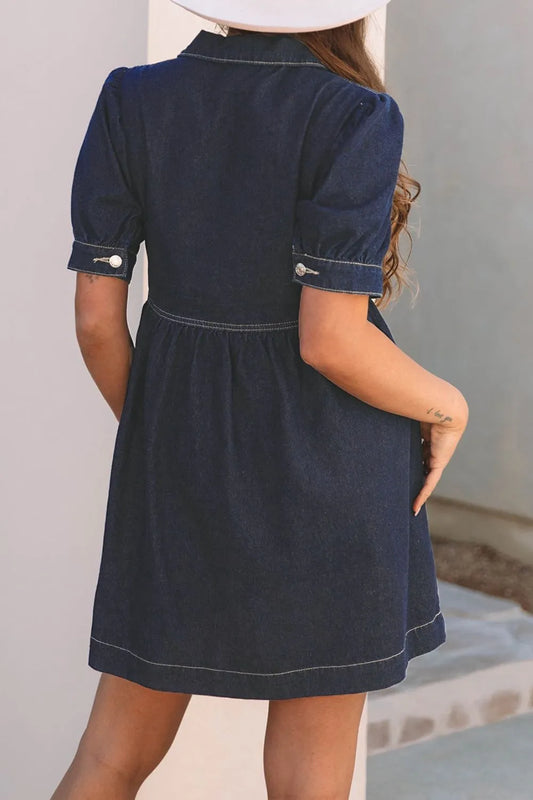 Ruffled Side Pockets Puff Sleeve Denim Mini Dress