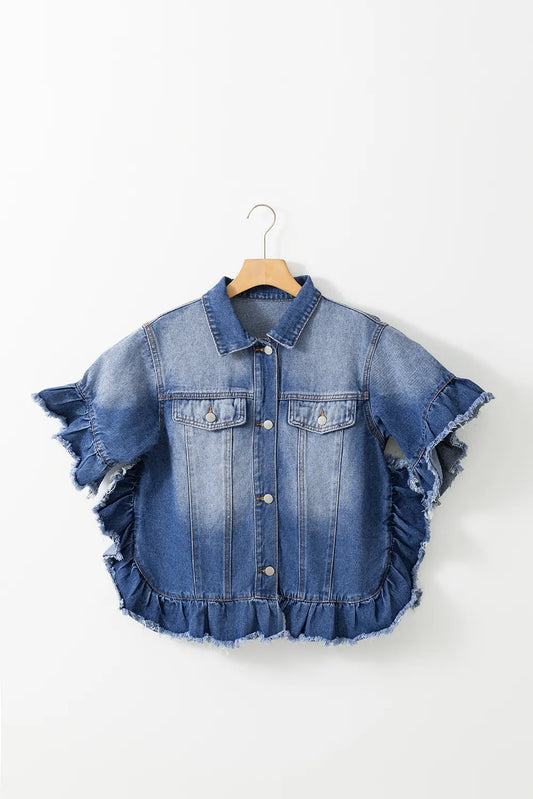 V Neck Ruffled Short Puff Sleeve Denim Top