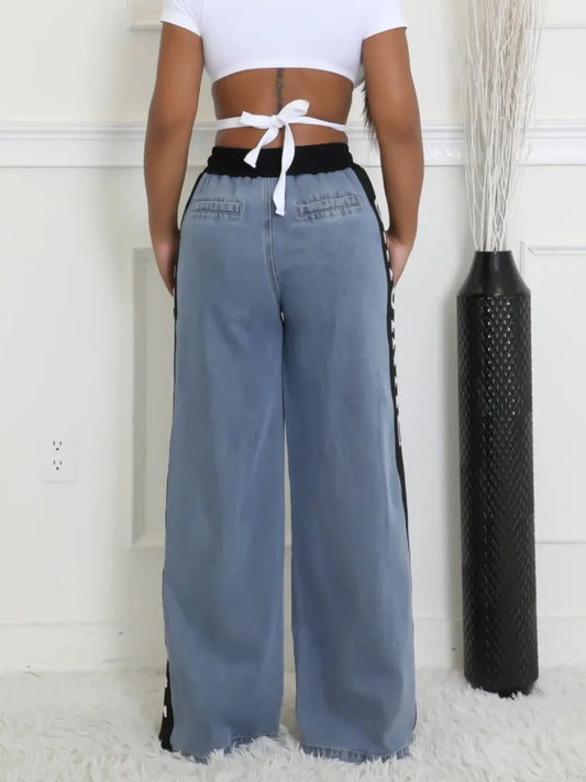 High Waist Wide Leg Denim Jeans with Side Letter Print
