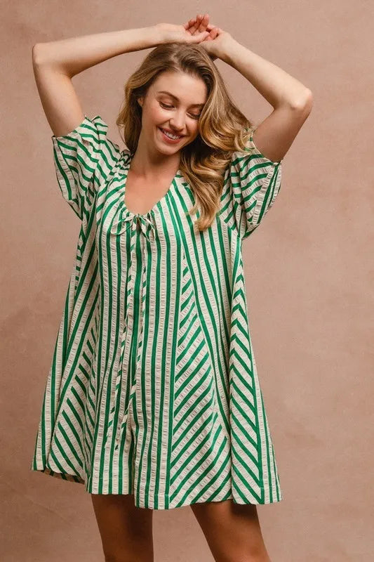 MABLE Striped Puff Sleeve Collared Neck Romper