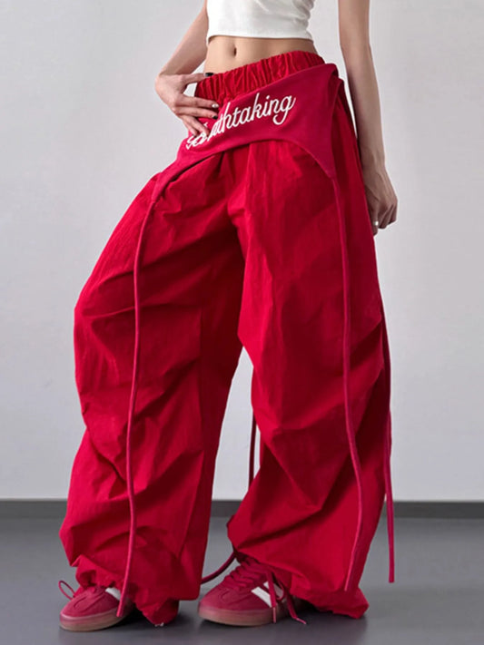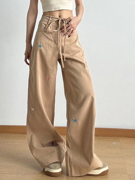 Bow Embroidered Wide Leg Drawstring Casual Pants