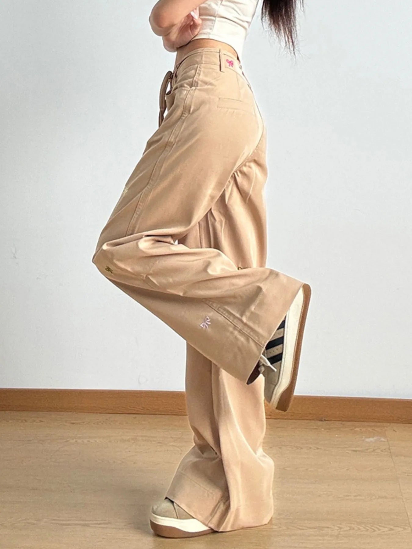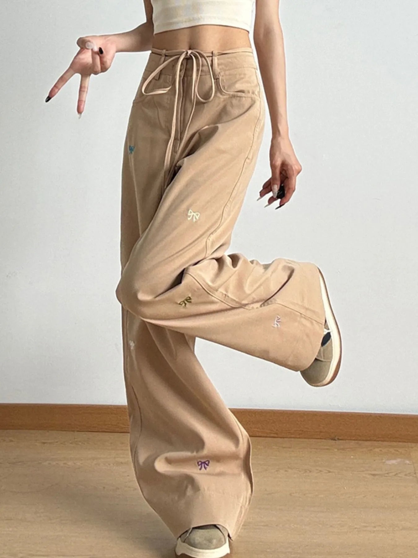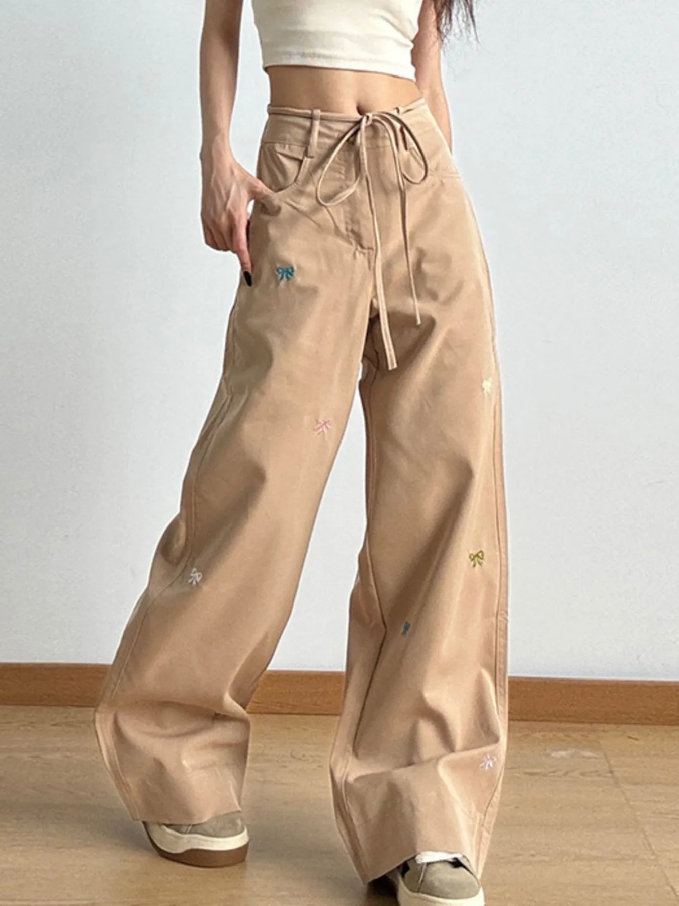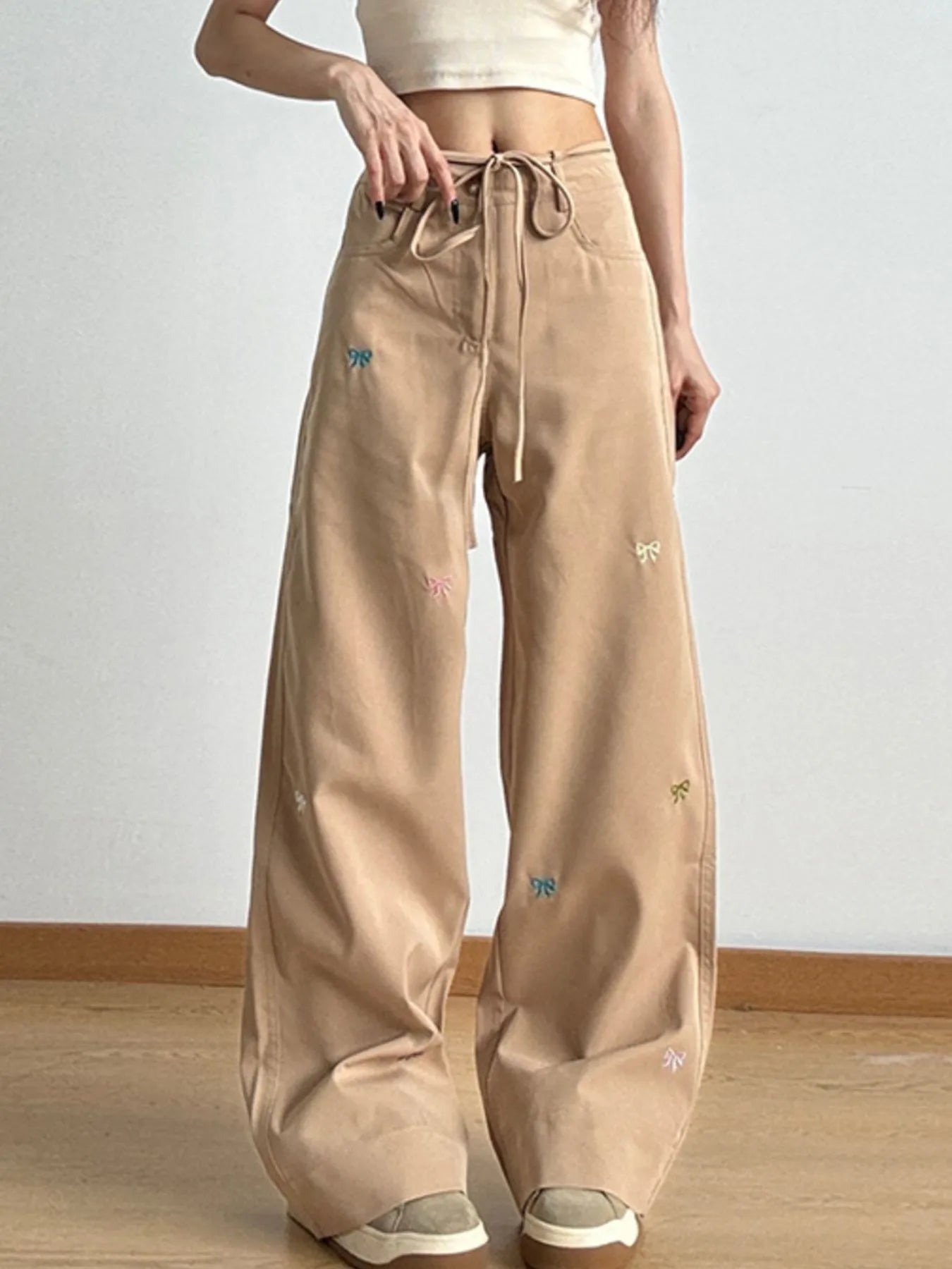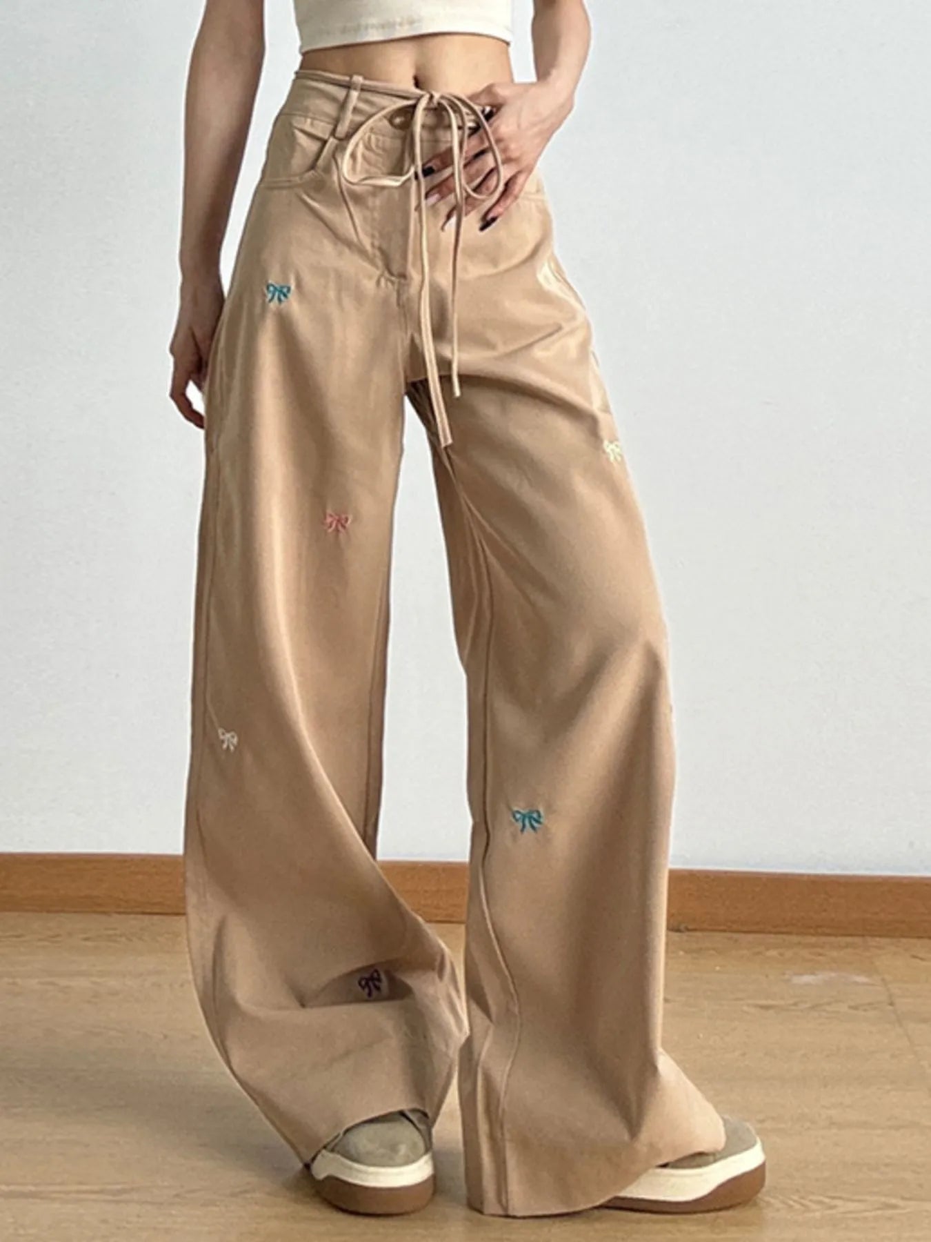 Bow Embroidered Wide Leg Drawstring Casual Pants