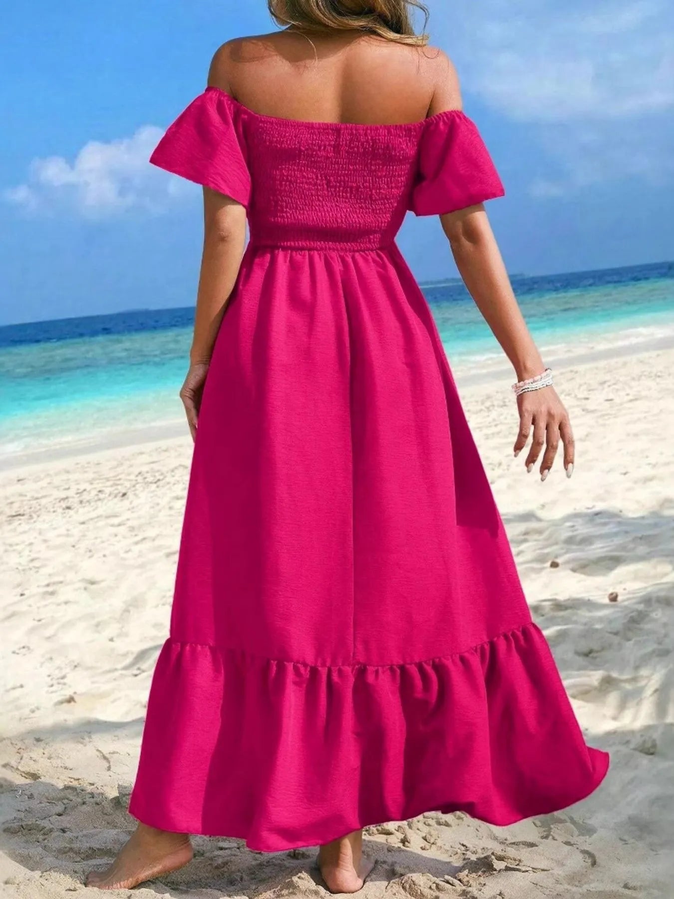 Off-Shoulder Smocked Maxi Dress with Ruffle Hem