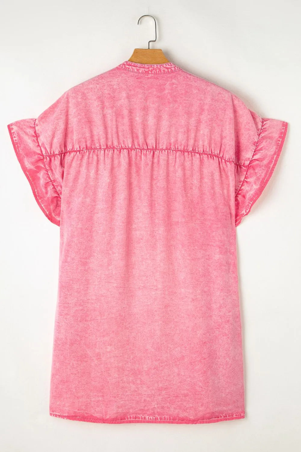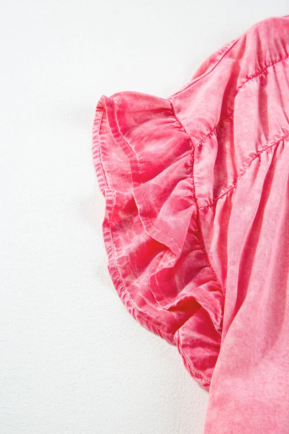 Ruffled Short Sleeve Buttoned Denim Mini Dress